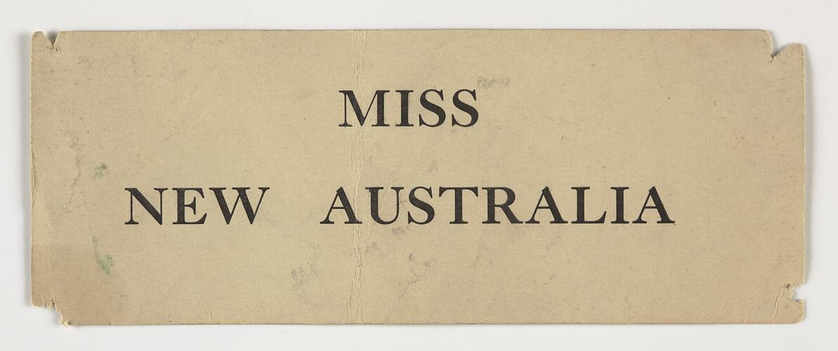 Small cardboard sign pinned to a sash worn by Bernice Kopple when she won the Miss New Australia beauty competition during her migrant voyage from Scotland to Australia, December 1950 onboard the ship New Australia'. A photograph of Bernice deckside wearing the sash and sign is also in the Museum's collection.