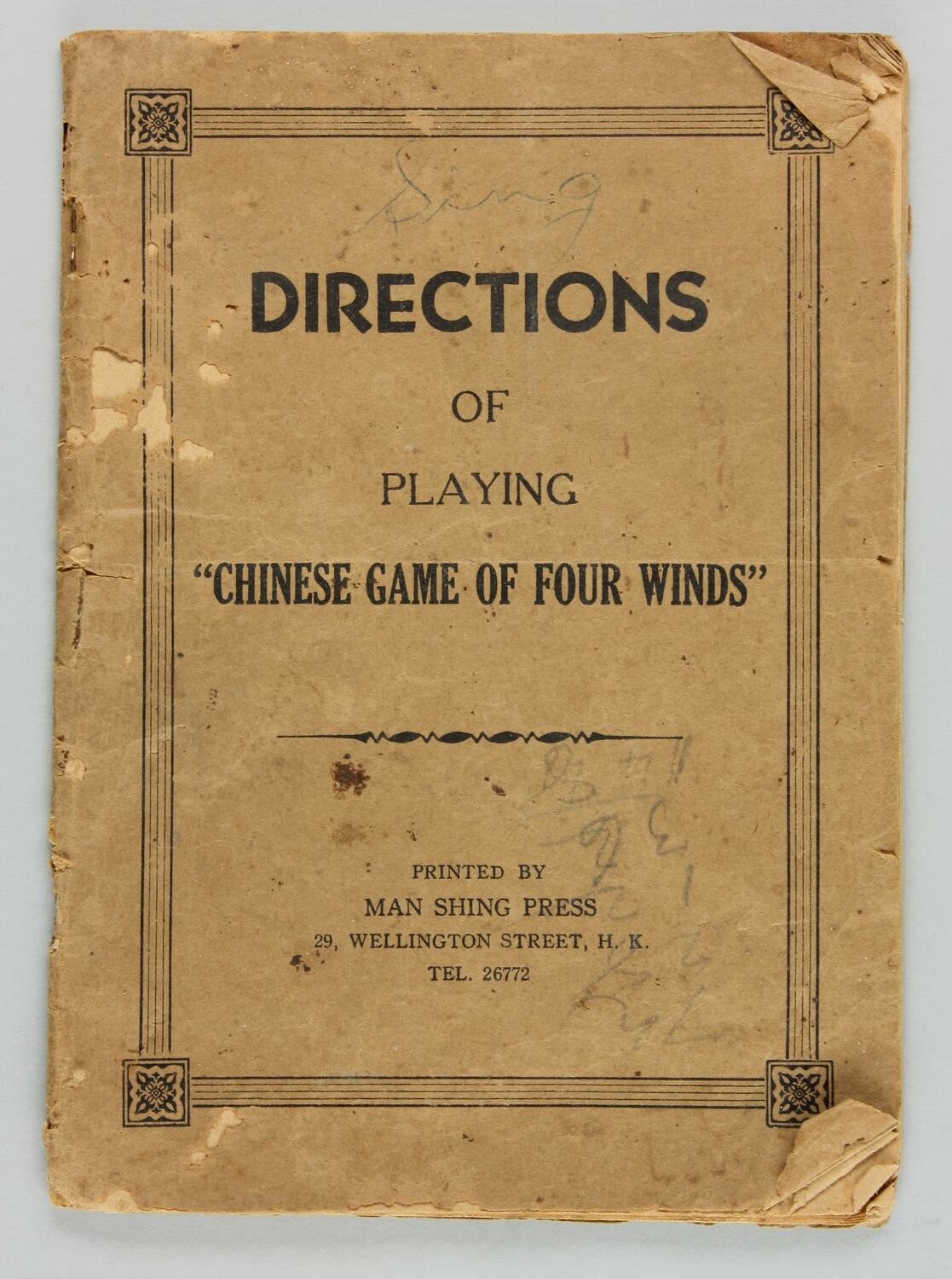 Booklet Front Cover: 'DIRECTIONS / OF / PLAYING / 'CHINESE GAME OF FOUR WINDS' / PRINTED BY / MANSHING PRESS / 29, WELLINGTON STREET, H.K. / TEL.26772'