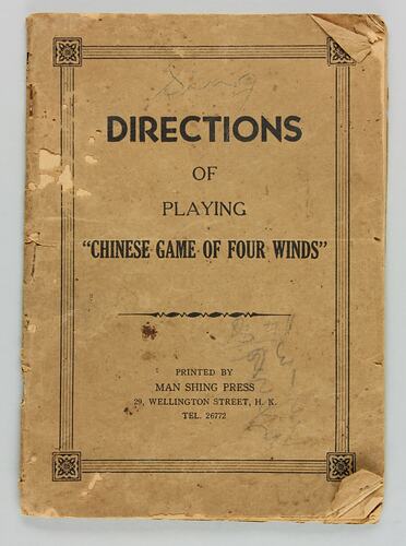 Instruction booklet for playing 'Chinese Game of Four Winds', stored with the Mahjong set. Used with Mahjong set which belonged to Sydney Louey Gung and Yun Ping and was brought to Australia by one of them when they migrated or during a return visit to China. Mahjong is a traditional and popular game originating in China which involves (allowing for some regional variations) the drawing and discarding of 144 tiles featuring Chinese characters and symbols until the legal hand is achieved. It is a game of skill, strategy and luck. The accompanying instruction booklet was printed in Hong Kong.