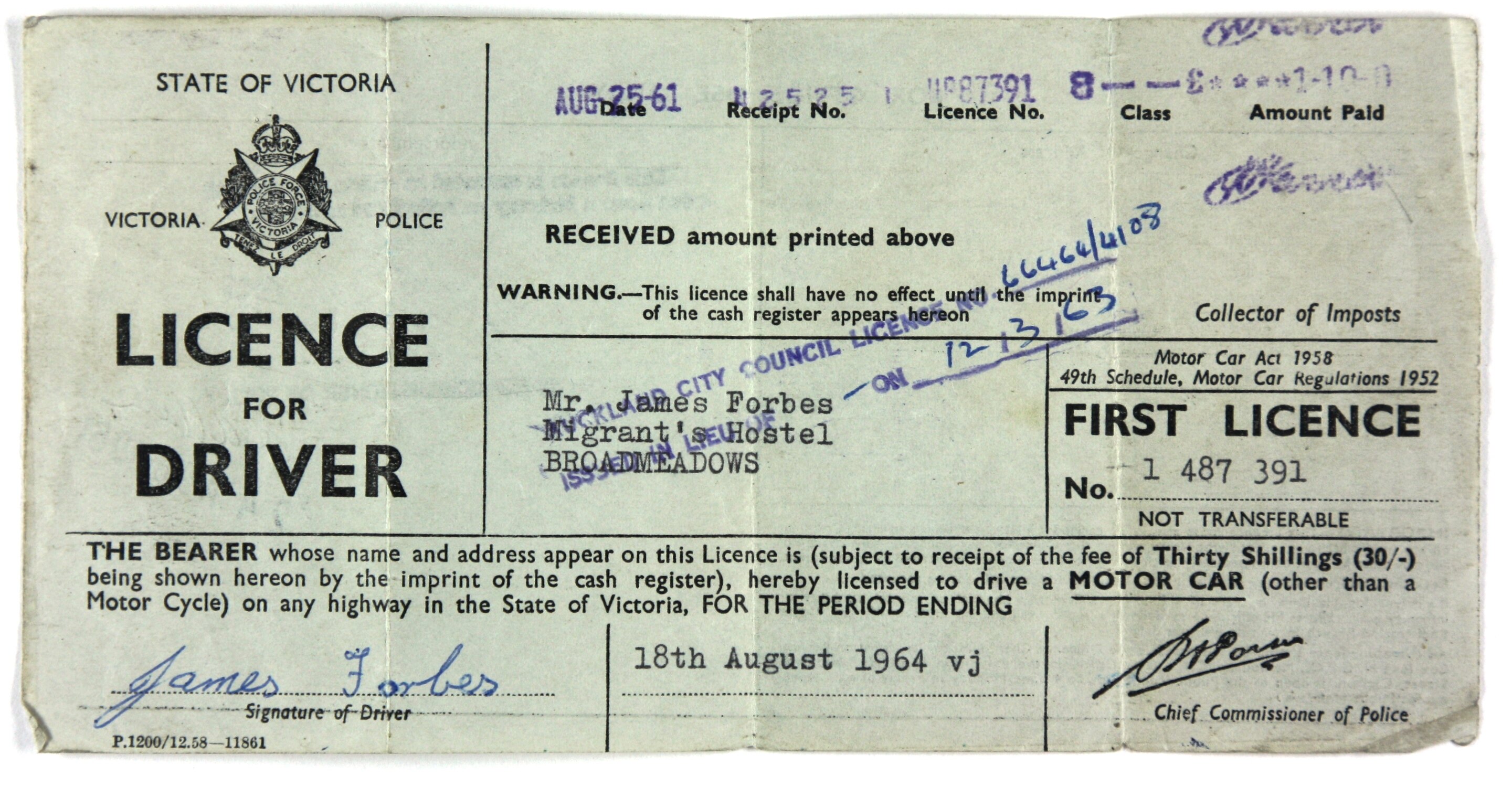 Standard driver's licence for James Forbes issued by the Victoria Police, State of Victoria, 25 Aug 1961 and valid until 18 August 1964. The document lists James' address as the Migrant Hostel at Broadmeadows and has also been stamped by Auckland City Council for use in New Zealand. in 1963.