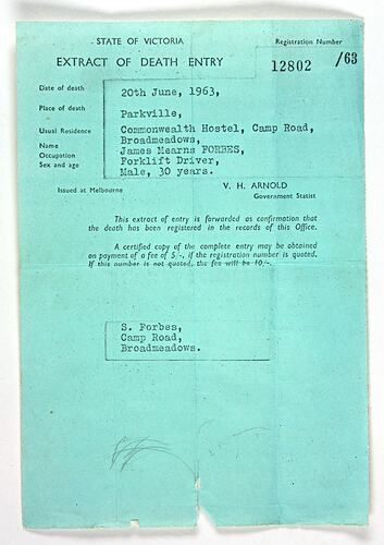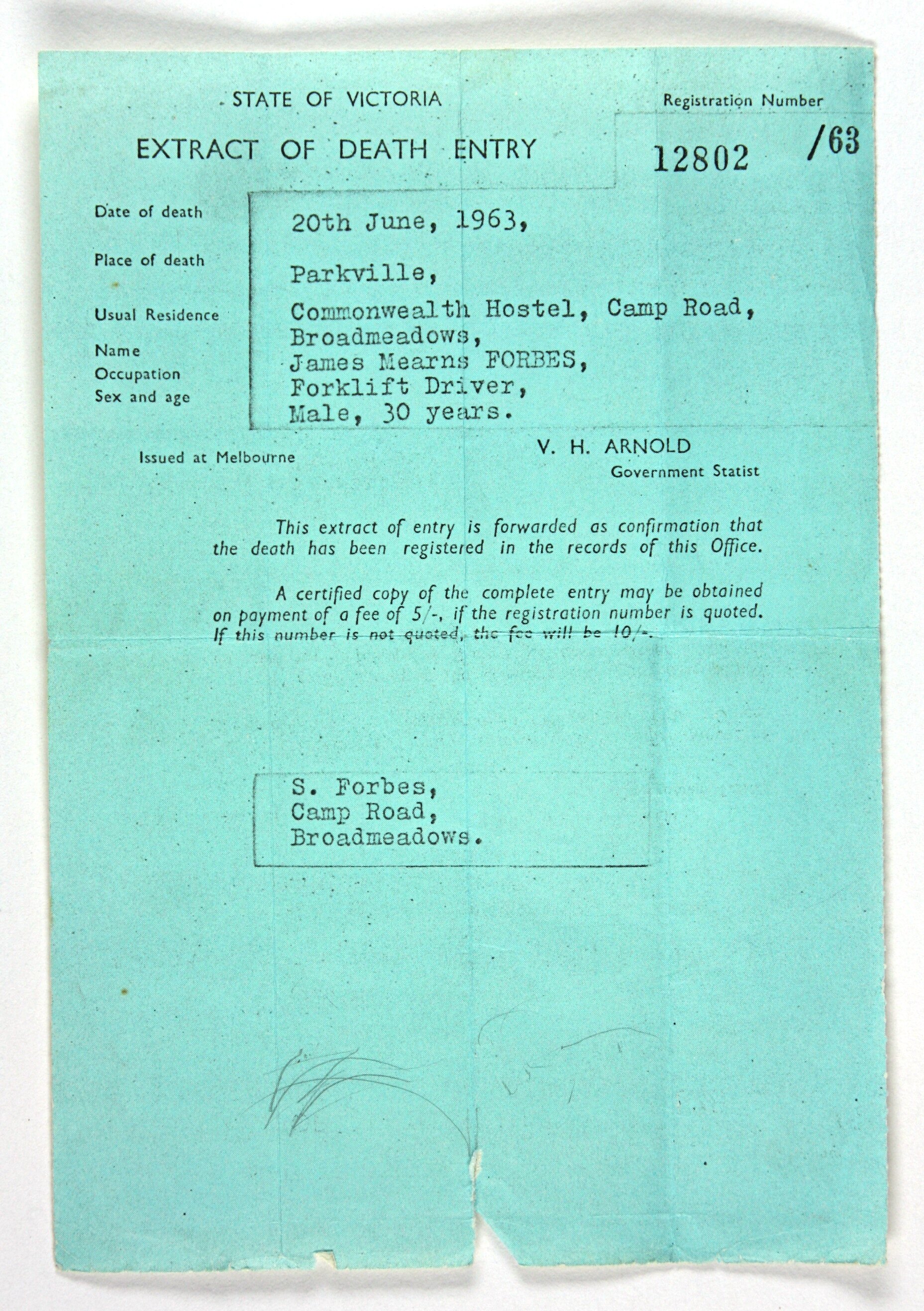 Extract of Death Entry for James Forbes, who died in an industrial accident on 20 June 1963. James, listed as a forklift driver and having died in Parkville, was employed by Stanton Pipes at the time, when he sustained a head injury in the workplace and died in hospital about 12 hours later. James was survived by his wife Sylvia and daughter Shirley the family having migrated from Scotland in 1961.