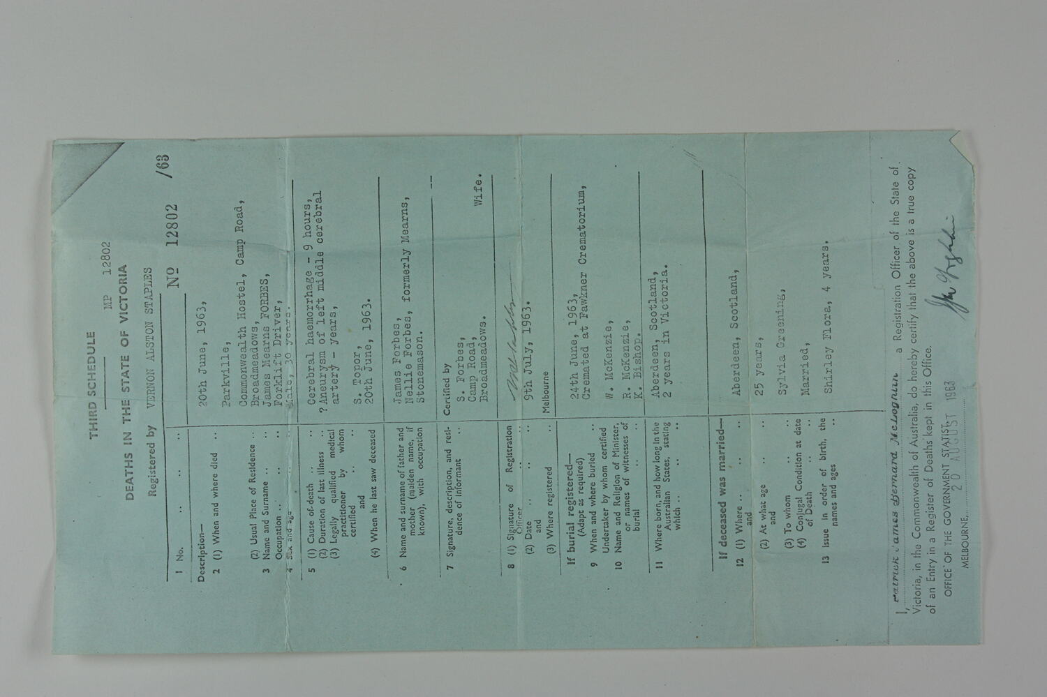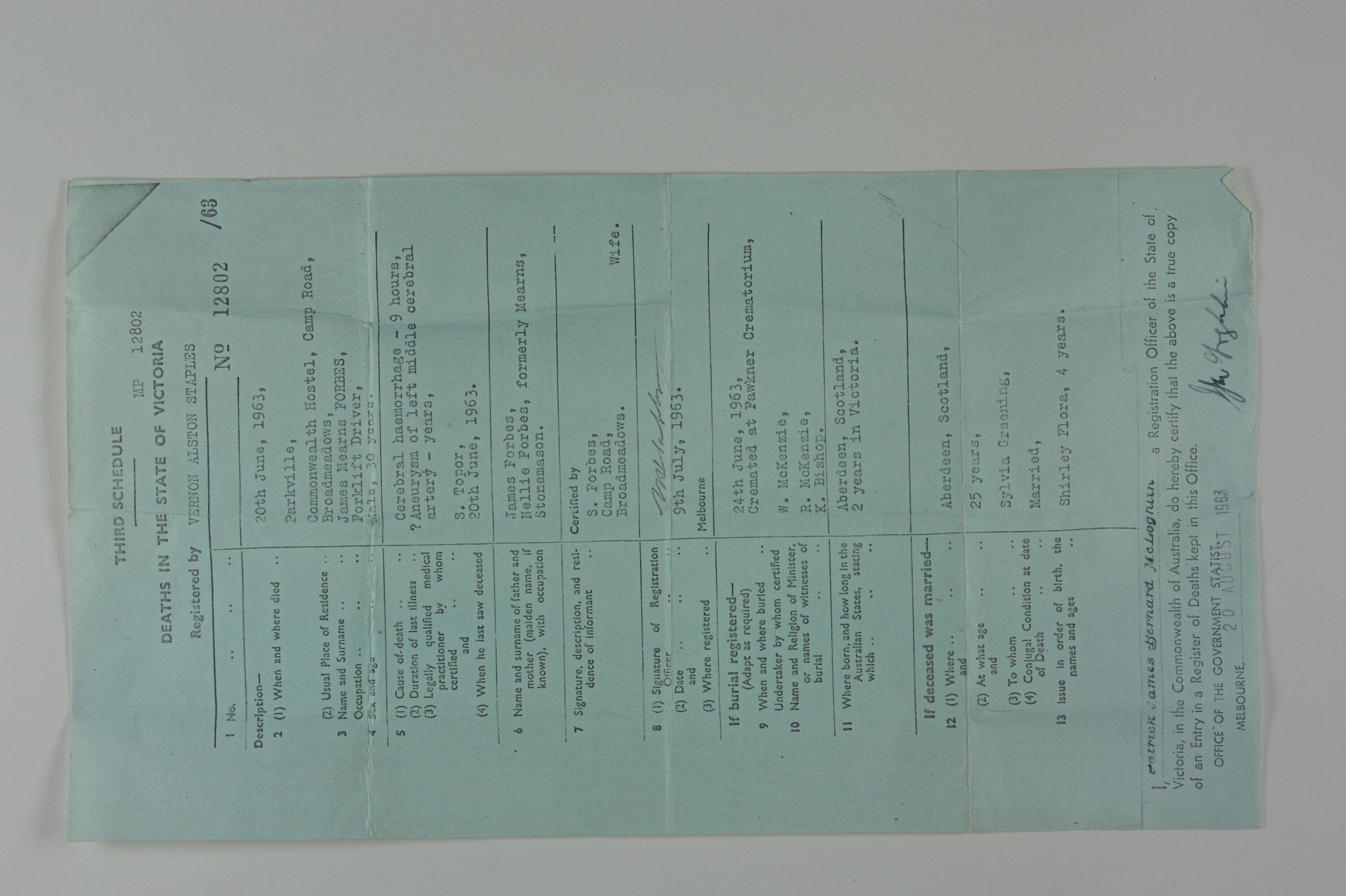 Register of Deaths Entry for James Forbes, who died in an industrial accident on 20 June 1963. James, listed as a forklift driver and having died in Parkville, was employed by Stanton Pipes at the time, when he sustained a head injury in the workplace and died in hospital about 12 hours later. James was survived by his wife Sylvia and daughter Shirley the family having migrated from Scotland in 1961. The register entry lists cause of death as a cerebral haemorrhage, James' place of residence as the Commonwealth Hostel, Camp Road, Broadmeadows, family details, place of birth and place of burial at Fawkner Crematorium.