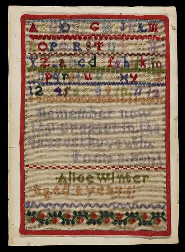Embroidered, coloured wool: Alphabet, numerals followed by 'Remember Thy Creator in the Days of Thy Youth / Ecclesiastes XII.I / Alice Winter/ aged 9 years'