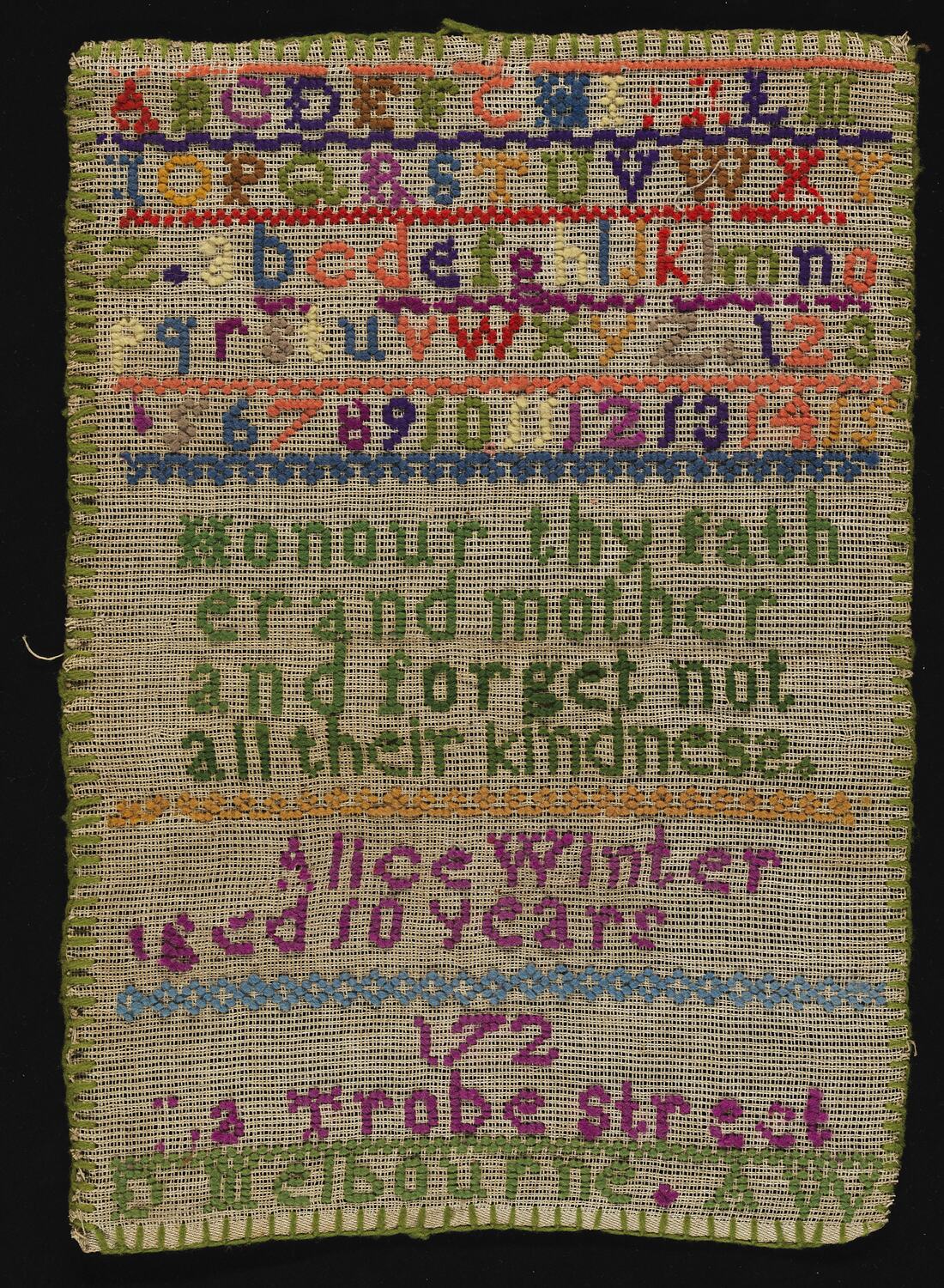 Embroidered, coloured wool: Alphabet, numerals followed by 'Honour thy fath/er and mother/ and forget not/ all their kindness' / Alice Winter/ aged 10 years / 172 Latrobe Street / D. (?) Melbourne / A.W'