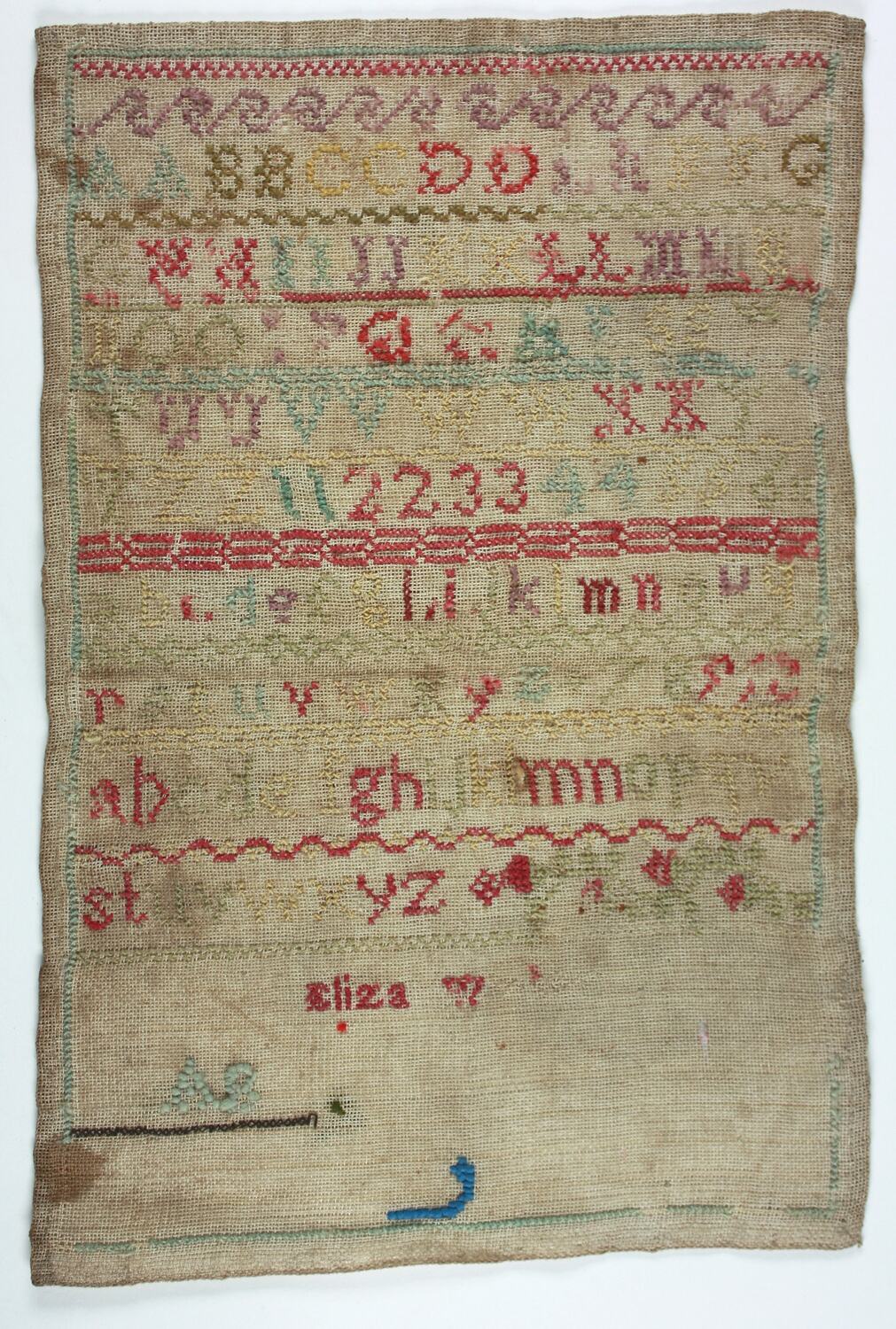 Embroidered, coloured wool: Alphabet, numerals followed by 'Eliza W...'