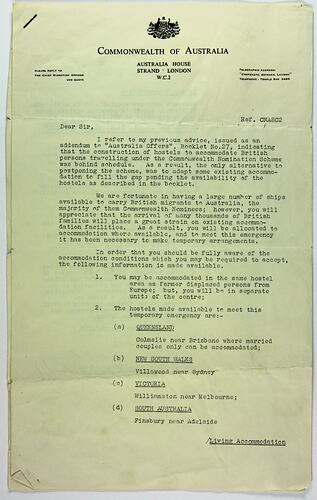 Letter sent by the Chief Migration Officer, Australia House in London to Stanley Hathaway between May and November 1951 (letter has no date). The letter advises Stanley that new arrangements regarding temporary accommodation in Australia for Commonwealth Nominee migrants are being made due to construction delays. The letter outlines locations, conditions and facilities, as well as an attachment regarding the basic wage in Australia.