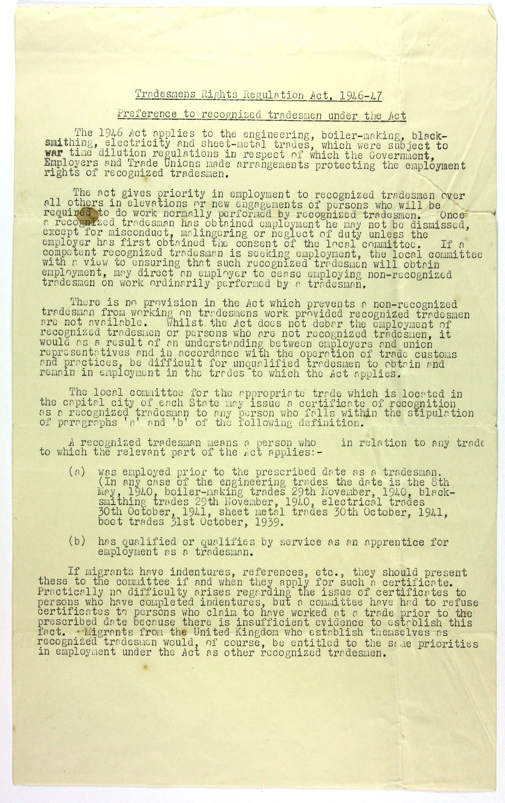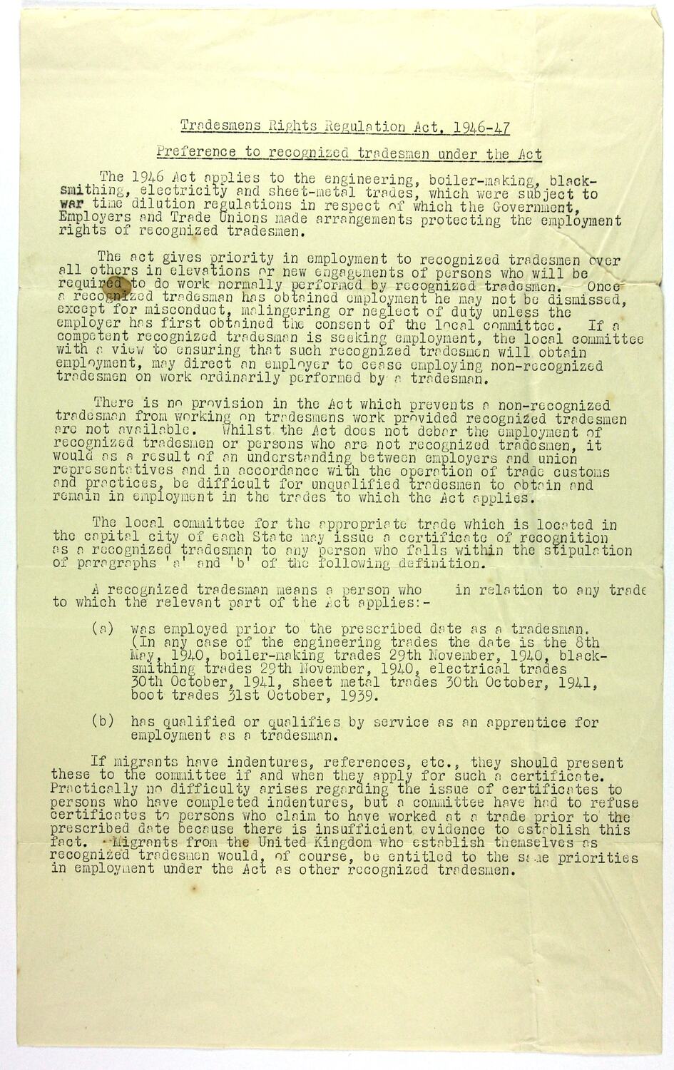 Information sheet sent by the Commonwealth of Australia to Stanley Hathaway, circa 1951 (no date). The sheet provides information regarding the Tradesmens Rights Regulation Act 1946-47 and its application to migrants in Australia.