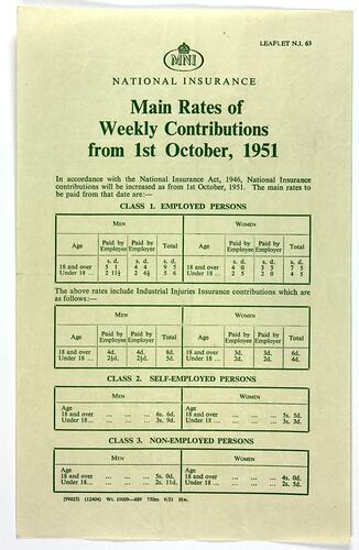 Information leaflet sent to Stanley Hathaway, in October-November 1951. The leaflet provides information regarding rates of weekly contributions to be made by employees under the British National Insurance Act of 1946.