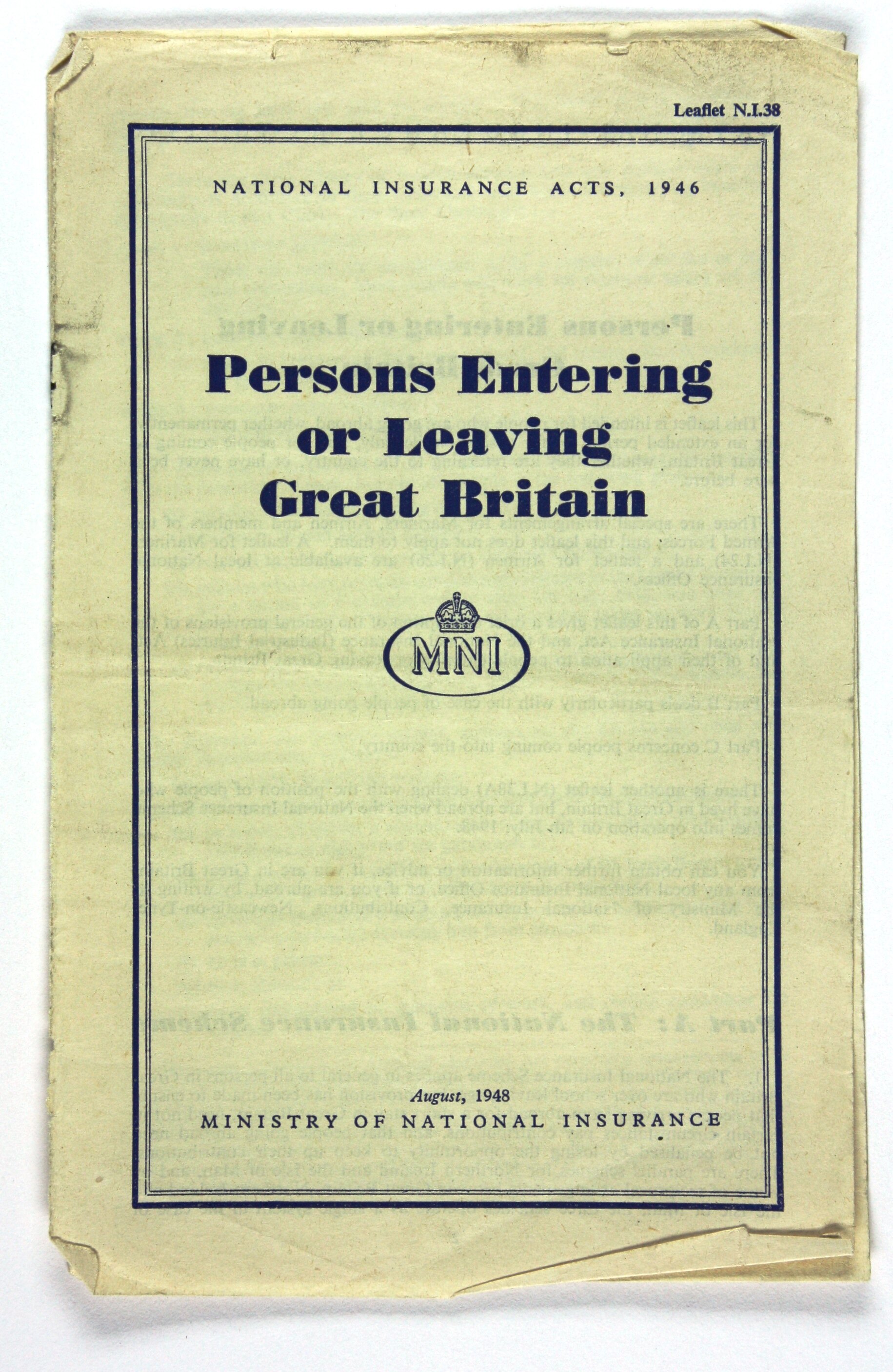 'NATIONAL INSURANCE ACTS, 1946/People Entering/or Leaving/Great Britain. August, 1948/ MINISTRY OF NATIONAL INSURANCE'