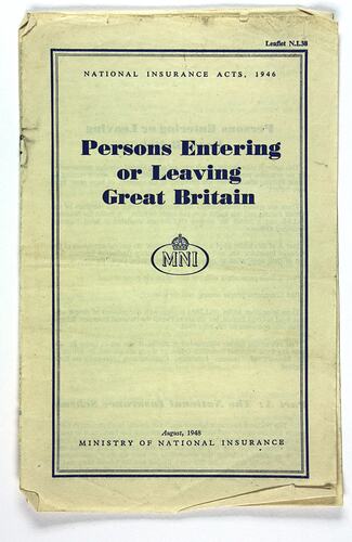 Six page information leaflet sent to Stanley Hathaway, in October-November 1951. The leaflet provides information regarding the National Insurance Scheme in Great Britain and how it pertains to people entering and leaving Great Britain..