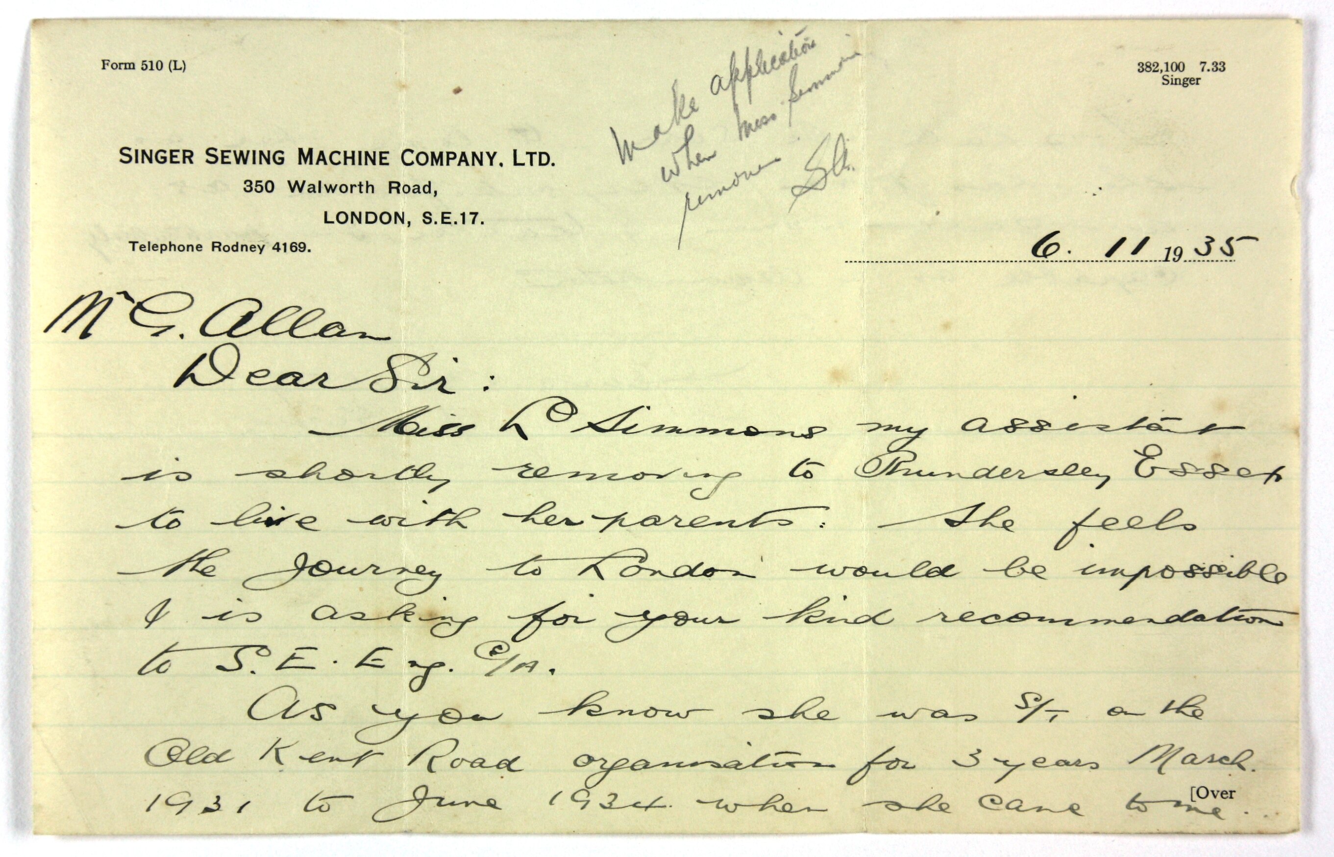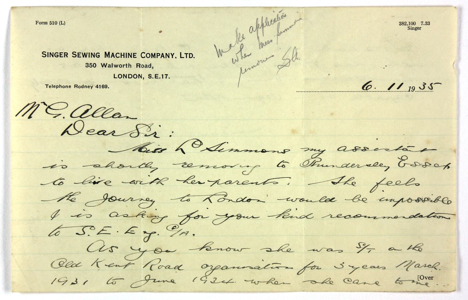 Masthead: 'SINGER SEWING MACHINE COMPANY, LTD./350 Walworth Road,;LONDON, S.E.1/...Mr G. Allan/Dear Sir...'...
