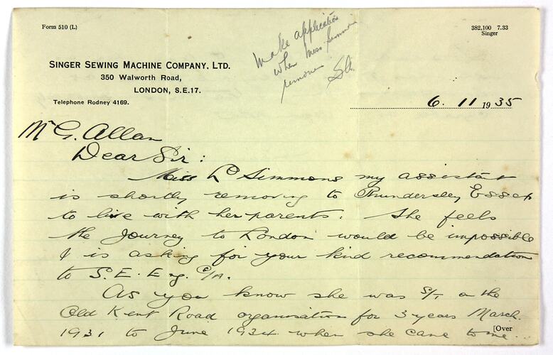 Letter to Lucy Simmons (later Hathaway) from J. Harris of the Walworth Road London Office of the Singer Sewing Machine Company, 6 November 1954. Lucy was employed by the Company as a sales representative and demonstrator in England during the 1930s and 1940s prior to and after her marriage and before migrating to Australia with her family in 1951. The letter refers to Lucy's hopes for a transfer due to her own domestic relocation and recommends Lucy as an excellent saleswoman, teacher and demonstrator.