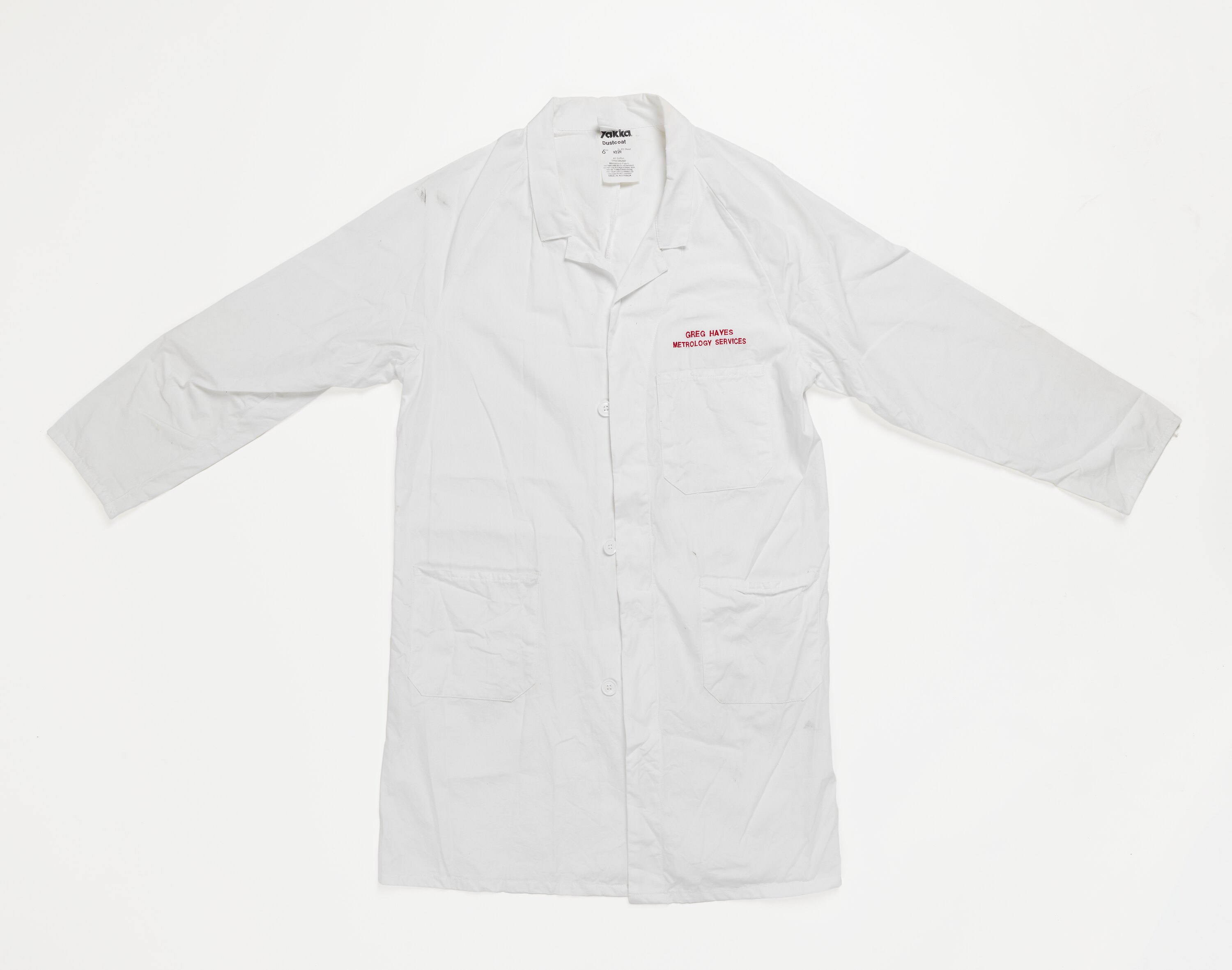 Dust coat for use in the Kodak Australasia Pty Ltd factory, Coburg, circa 2000s by Greg Hayes of the Metrology Department. The coat is Hard Yakka brand.