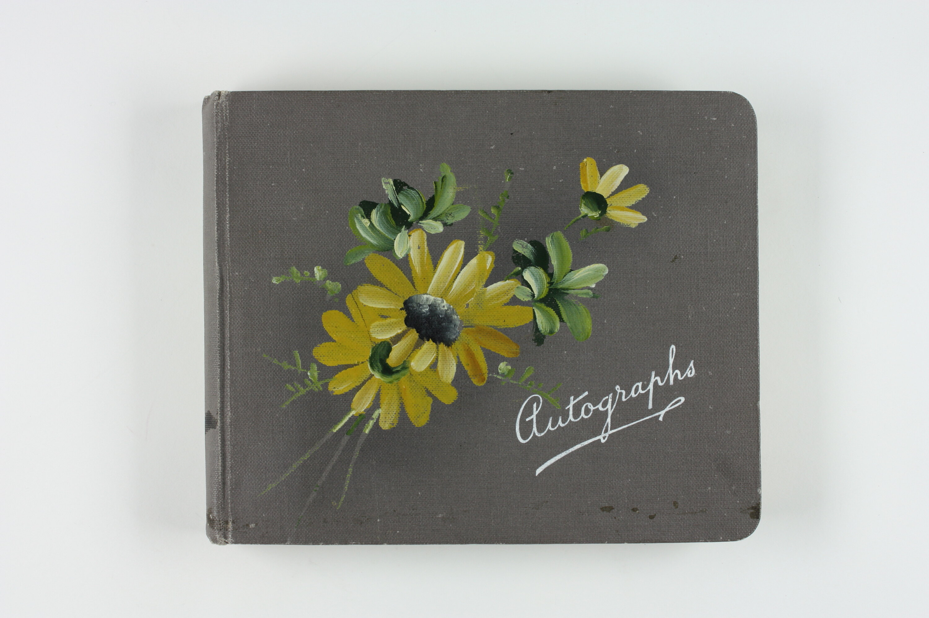 Autograph album with grey cover, with painted image of yellow daisies and green foliage, and title in white 'Autographs'. Album contains interspersed white, pink and blue pages, some inscribed, many blank. Owner's name and date written on first inside page. Inside covers papered with pale green on white floral design. This paper is torn inside the front cover, at the lower edge. The back cover and a pink page have been repaired with adhesive tape, now very deteriorated.