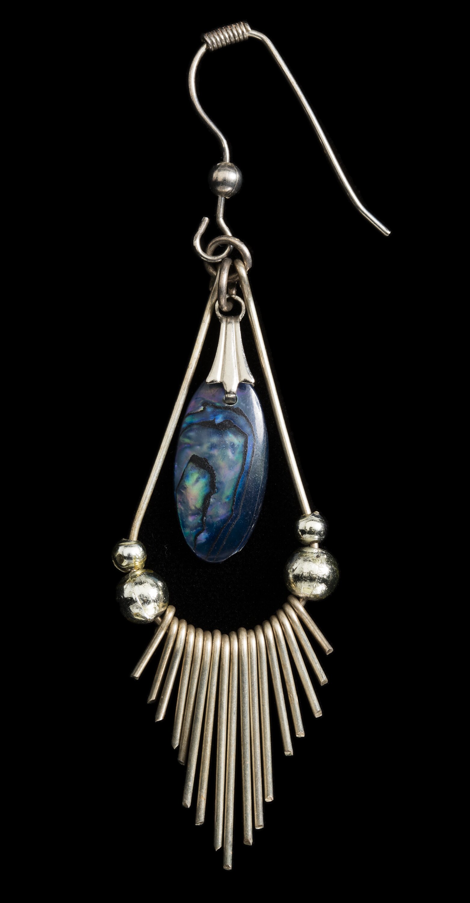One of a pair of pendant hook earrings with turquoise shell pieces hanging in silver metal decorative hoops with metal fringe, worn by Bernice Kopple between the 1960s and 1980s. Bernice migrated from Scotland to Australia in 1950.