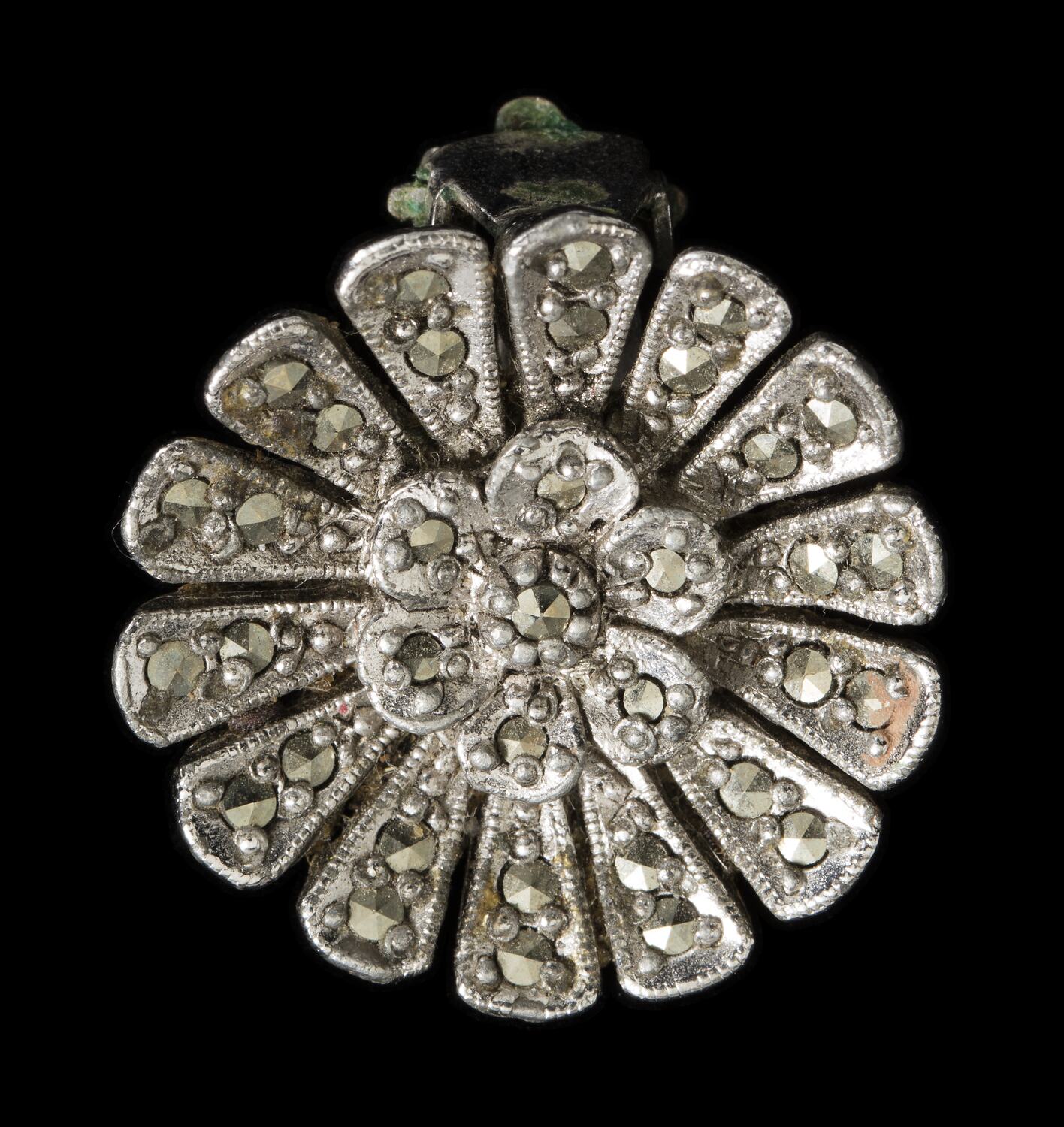 One of a pair of silver clasp earrings in a daisy shape with diamente decoration, worn by Bernice Kopple between the 1960s and 1980s. There is also a matching ring (HT38809). Bernice migrated from Scotland to Australia in 1950.