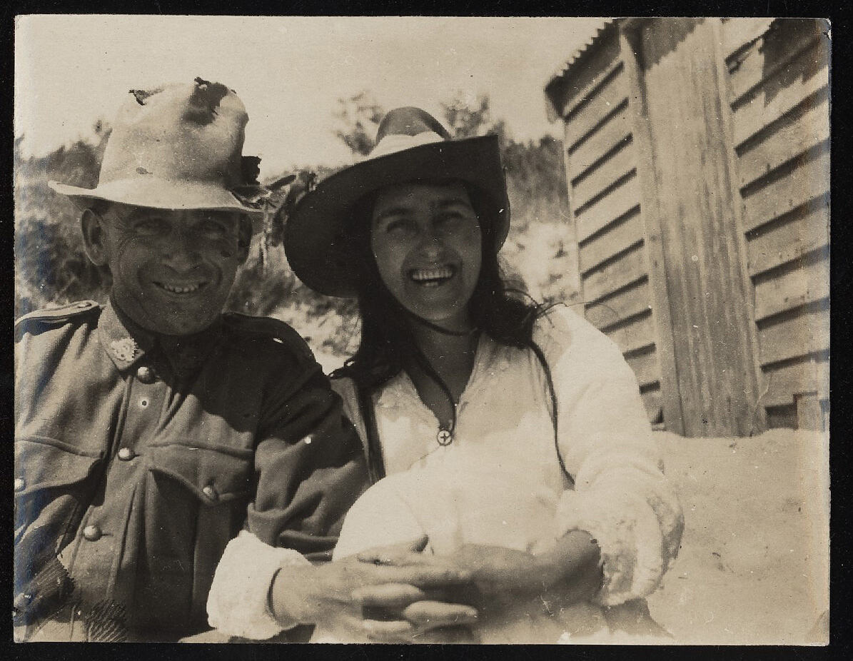 A man in a military uniform and woman sitting arm-in-arm on a beach at Aspendale, they appear to have swapped hats. In the background is a beach hut.