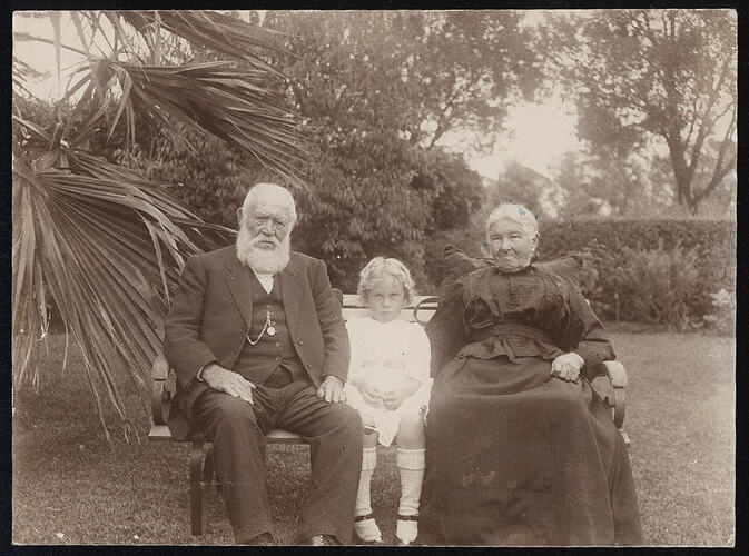 Photograph taken in a garden in April 1920, depicting 'Uncle Tom', aged 86, 'Grandma' aged 84 and 'Betty', aged 6.