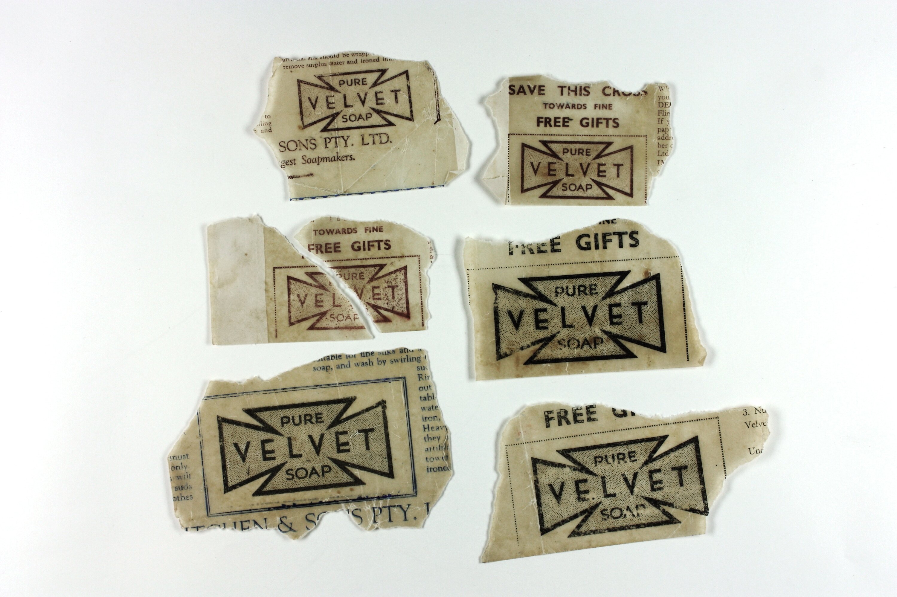 A pamphlet was available which listed products that could be exchanged for Velvet soap cut-out coupons, or 'crosses' as they were called (refer HT 39185). The coupons came with cakes (bars) of Velvet soap, used for hand-washing clothes. Crosses came in three different colours, with different values: brown, the lowest value; blue; and black, the highest value.