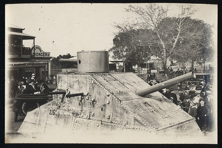 Photograph of a (possibly faux) armoured car, apparently being used for fundraising for the war effort in a Victorian country town. One of the shops has the sign '...E ROGERS IRONMONGERS...& CROCKERY WARE'. This may be G.E. Rogers, iron monger in Playne Street, Frankston.