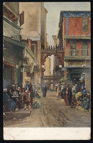 Postcard depicting crowded street scene showing the Hotel du Nil at Cairo, Egypt. It was sent by 'Otto', probably an Australian soldier, to Miss Elsie Storie of Brunswick around 1915. He writes that 'All the pangs of leaving home & friends are quite repaid by the wonderful sights'.