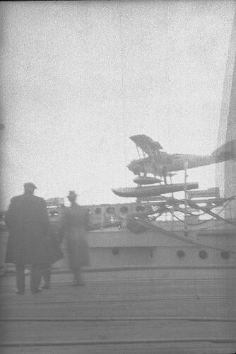 Onboard USS Nevada, Port Melbourne, 1925, with seaplane visible on deck. Part of a photographic envelope containing four black and white negatives, and three black and white photographs of the American Fleet at Port Melbourne, 1925. The 43 vessels of the American Fleet arrived in Melbourne during its Australian tour on 23 July 1925. Thousands of people gathered at Port Melbourne, and were treated to an 'excellent display' of American seaplanes which had been 'catapulted' from vessels near the heads. The occasion was soured when a Federal Government party, including the Prime Minister was unable to voyage down the bay to greet the Fleet 'owing to the disgraceful conduct of a few fireman and greasers' making pay demands. The Fleet left Melbourne on 6 August.