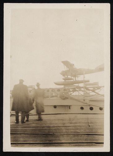 Onboard USS Nevada, Port Melbourne, 1925. A seaplane is visible on the deck. Part of a photographic envelope containing four black and white negatives, and three black and white photographs of the American Fleet at Port Melbourne, 1925. The 43 vessels of the American Fleet arrived in Melbourne during its Australian tour on 23 July 1925. Thousands of people gathered at Port Melbourne, and were treated to an 'excellent display' of American seaplanes which had been 'catapulted' from vessels near the heads. The occasion was soured when a Federal Government party, including the Prime Minister was unable to voyage down the bay to greet the Fleet 'owing to the disgraceful conduct of a few fireman and greasers' making pay demands. The Fleet left Melbourne on 6 August.