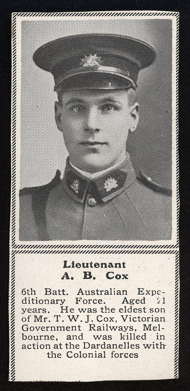 Printed on the cutting; 'Lieutenant / A.B. Cox / 6th Batt. Australian Expe- / ditionary Force. Aged 21 / years. He was the eldest son / of Mr. T. W. J. Cox, Victorian / Government Railways, Mel- / bourne, and was killed in action at the Dardanelles with / the Colonial forces'