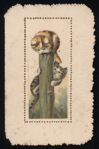 Small cream card with deckled edges; illustration on the cover of two cats playing around a post; inside page has printed and hand written text.