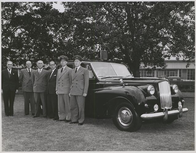 Two Commonwealth Service Car drivers and other officials at the hand over ceremony of an Austin Princess car, which was loaned to the Service by Nuffields to drive the Duke of Edinburgh around Australia during his visit in 1956, primarily to officially open the Olympics Games at the MCG.