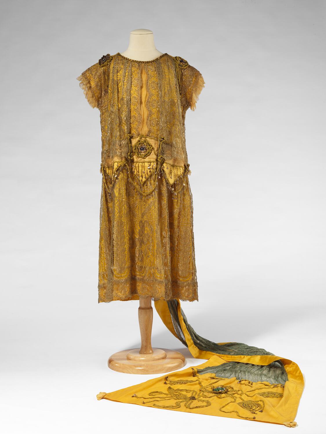 Gold-coloured knee-length dress with gold and green lace overlay and long train attached at back shoulders. Train has silver overlay which ends slightly short of underlay, revealing embroidered floral pattern at end. Dress has beaded fringe at slightly dropped waist; short sleeves with lace trim; and round neckline. Rosette at centre waist and on each shoulder, made of gold lace and beads.