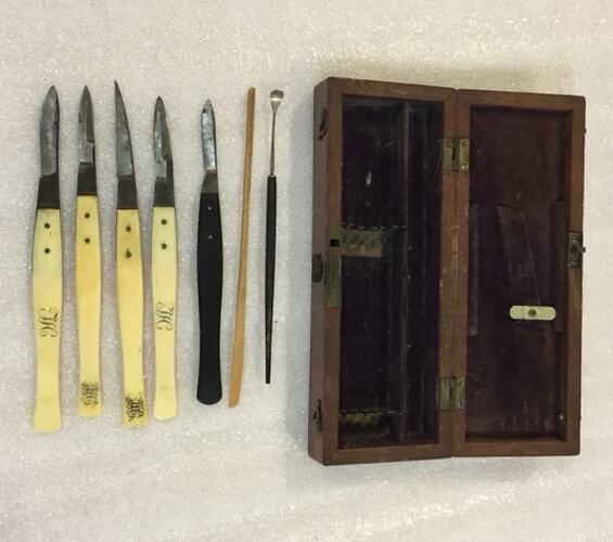 A small wooden box with hinged lid containing seven dissecting tools. The lid is attached with two brass hinges on the back. On the front are two metal closures, one each end. In the centre is a lock to be operated by a key which is missing. On top of the lid is a rectangular metal plate that has been engraved with McNally's initials. This engraving has been repeated on the bone handles of four scalpels. The bottom of the box contains two sections for storing tools; the first section running lengthwise taking up one third of the width, while the second section uses two thirds of the width and contains two metal supports screwed into the bottom of the box to hold six tools. The first section contains two tools, one a spatula made of wood, and a metal tool with black ebony handle. The second section contains five scalpels with blades of varying shape and length, one with black handle, the remaining four have bone handles inscribed with initials as noted above. Inside the lid has been shaped to provide additional storage and there is one metal stay for holding at least one more tool in place. A hole nearby would indicate a second stay is missing. Both the top and bottom inside the box are lined with brown felt.
