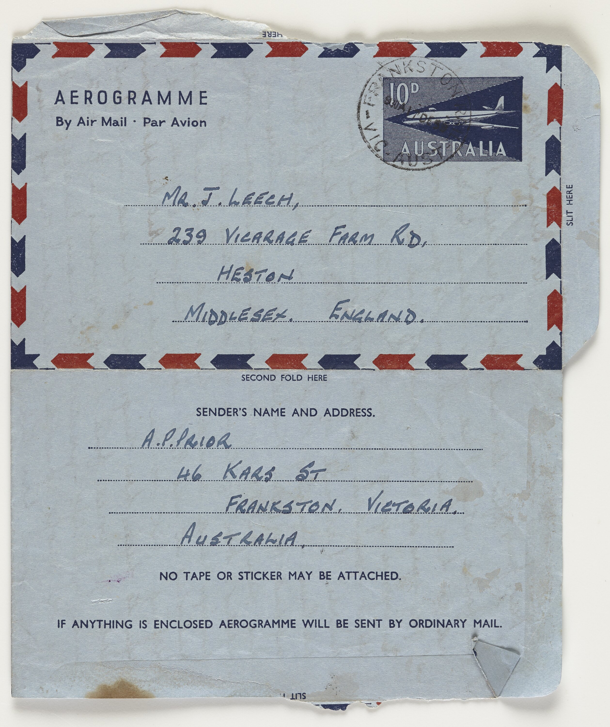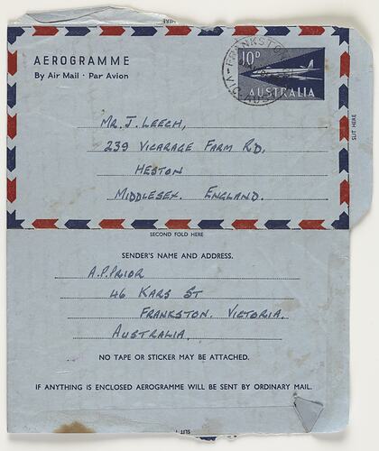 Aerogram letter written to Jim Leech in Heston, Middlesex, England, dated 16 December 1959. It is from Frankston Soccer Club friend A.P. Prior, nickname 'Nippy', who refers to England as the 'Blighted Kingdom' and that 'I should imagine that just lately you have been wishing that you were anywhere but in England far from the papers and the pictures we have seen on TV you've certainly had some crook weather. Here of course we are getting well into summer and already have had some real stinkers...' He describes changes in Frankston, improved train services, reports on the Frankston Soccer Club and family news. James, Eileen and Susan Leech had migrated to Australia in November 1953 and returned to England in Febuary 1956.