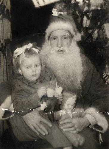 Photograph of Susan Leech, daughter of Eileen and James Leech, sitting on Father Christmas' lap, England, early 1950s. It was amongst a selection of photographs possibly brought to Australia when Eileen, James and Susan migrated to Australia in 1953 and also amongst those they brought back to England when they returned in 1956.