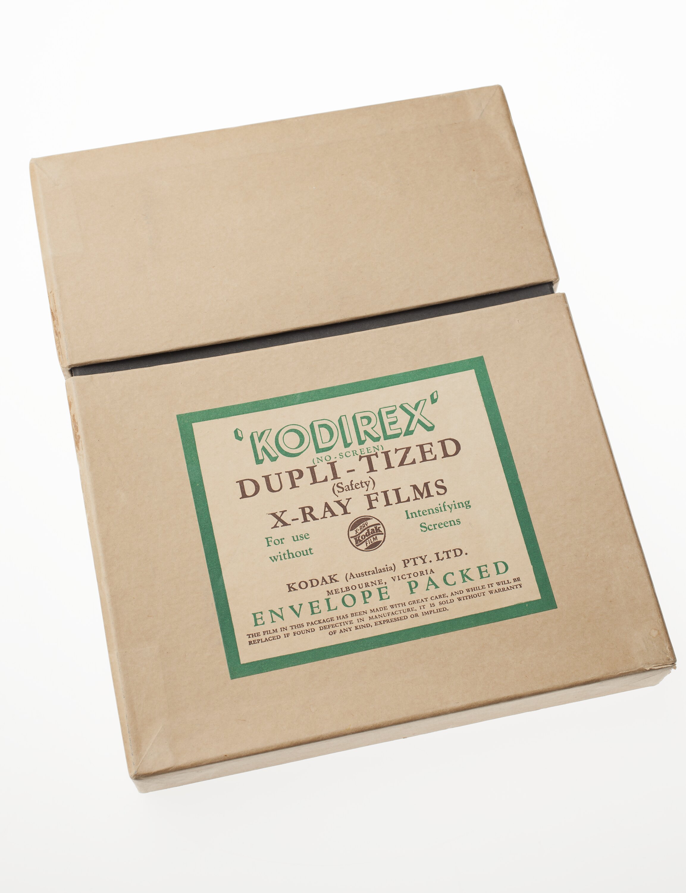 Box of unused Kodirex Duplitized Safety X-Ray Film, manufactured by Kodak Australasia Pty Ltd, about 1955.
