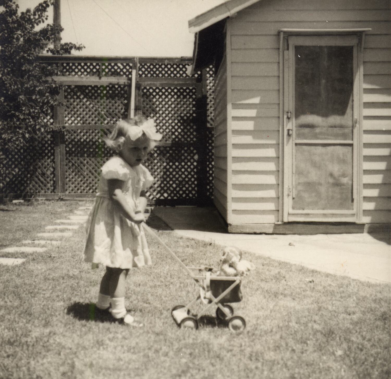 Photograph of Susan Leech pushing her toy pram in her back yard in Sandringham, Melbourne, circa 1954. Susan had migrated with her parents Eileen and James Leech to Melbourne from England in 1953 and they returned to England in 1956. The family first lived at 19 Nelson Street Sandringham and then moved for the majority of their stay in Melbourne to 130 Dandenong Road Frankston.