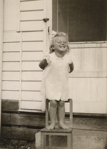 Photograph of Susan Leech standing on a chair in her backyard in Frankston, Melbourne, circa 1954. Susan had migrated with her parents Eileen and James Leech to Melbourne from England in 1953 and they returned to England in 1956. The family first lived at 19 Nelson Street Sandringham and then moved for the majority of their stay in Melbourne to 130 Dandenong Road Frankston.