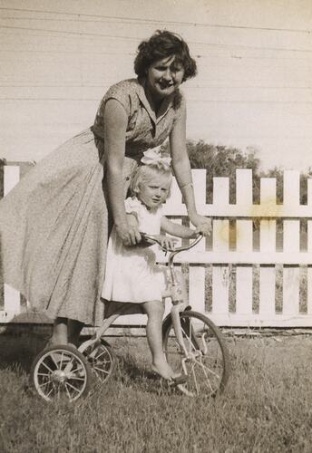 Photograph of Eileen Leech and her daughter Susan riding her tricycle in her back yard in Frankston, Melbourne, circa 1954. Susan had migrated with her parents Eileen and James Leech to Melbourne from England in 1953 and they returned to England in 1956. The family first lived at 19 Nelson Street Sandringham and then moved for the majority of their stay in Melbourne to 130 Dandenong Road Frankston.