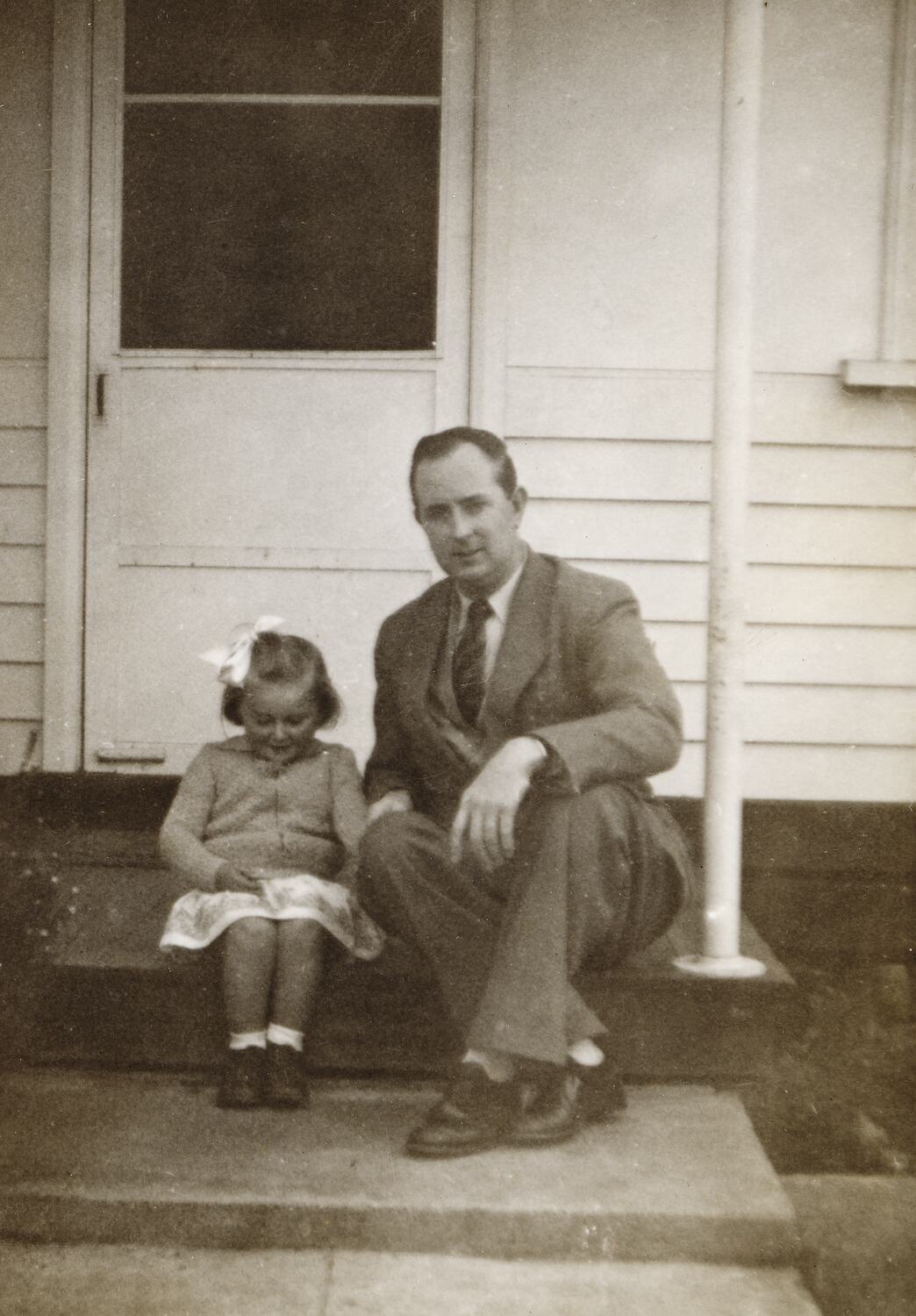 Photograph of James Leech and his daughter Susan sitting on the back steps of their home in Sandringham, Melbourne, circa 1954. Susan had migrated with her parents Eileen and James Leech to Melbourne from England in 1953 and they returned to England in 1956. The family first lived at 19 Nelson Street Sandringham and then moved for the majority of their stay in Melbourne to 130 Dandenong Road Frankston.
