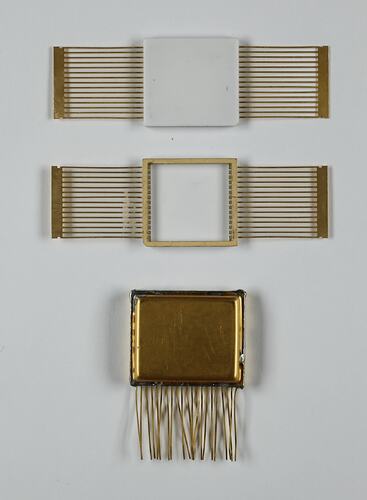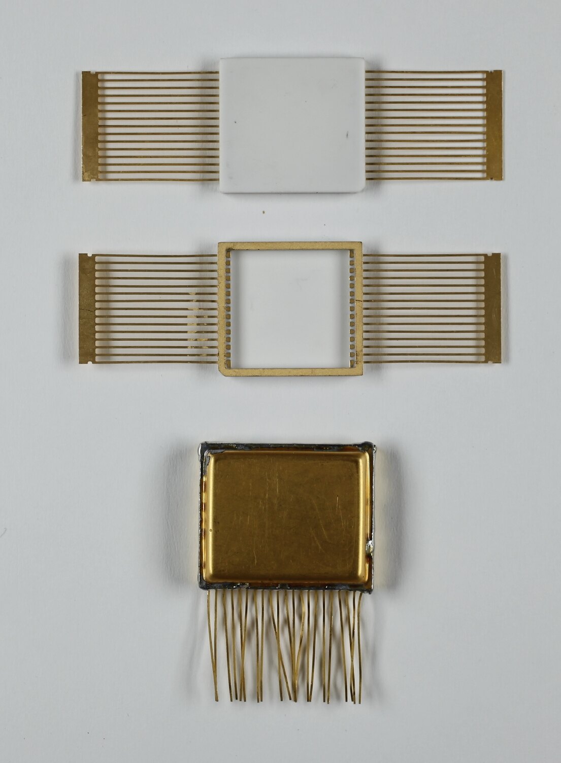 Soldered gold box experimental bionic ear implant, and two gold electrode connectors.