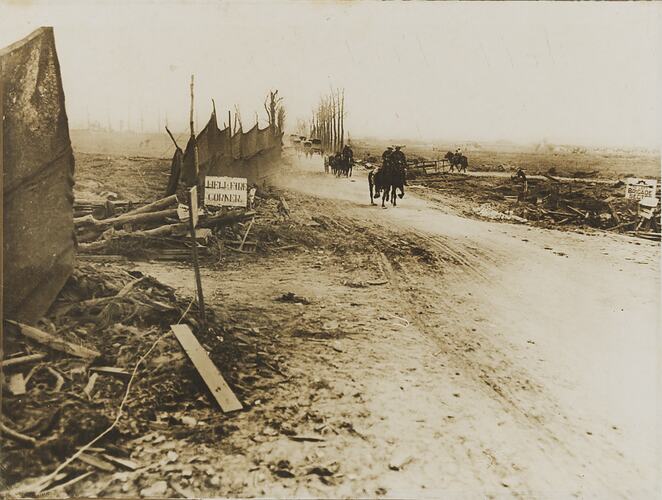 Photograph of soldiers on horesback and carriage on a road in a battlefield during World War I.