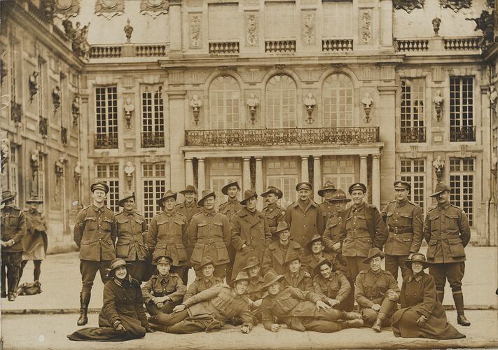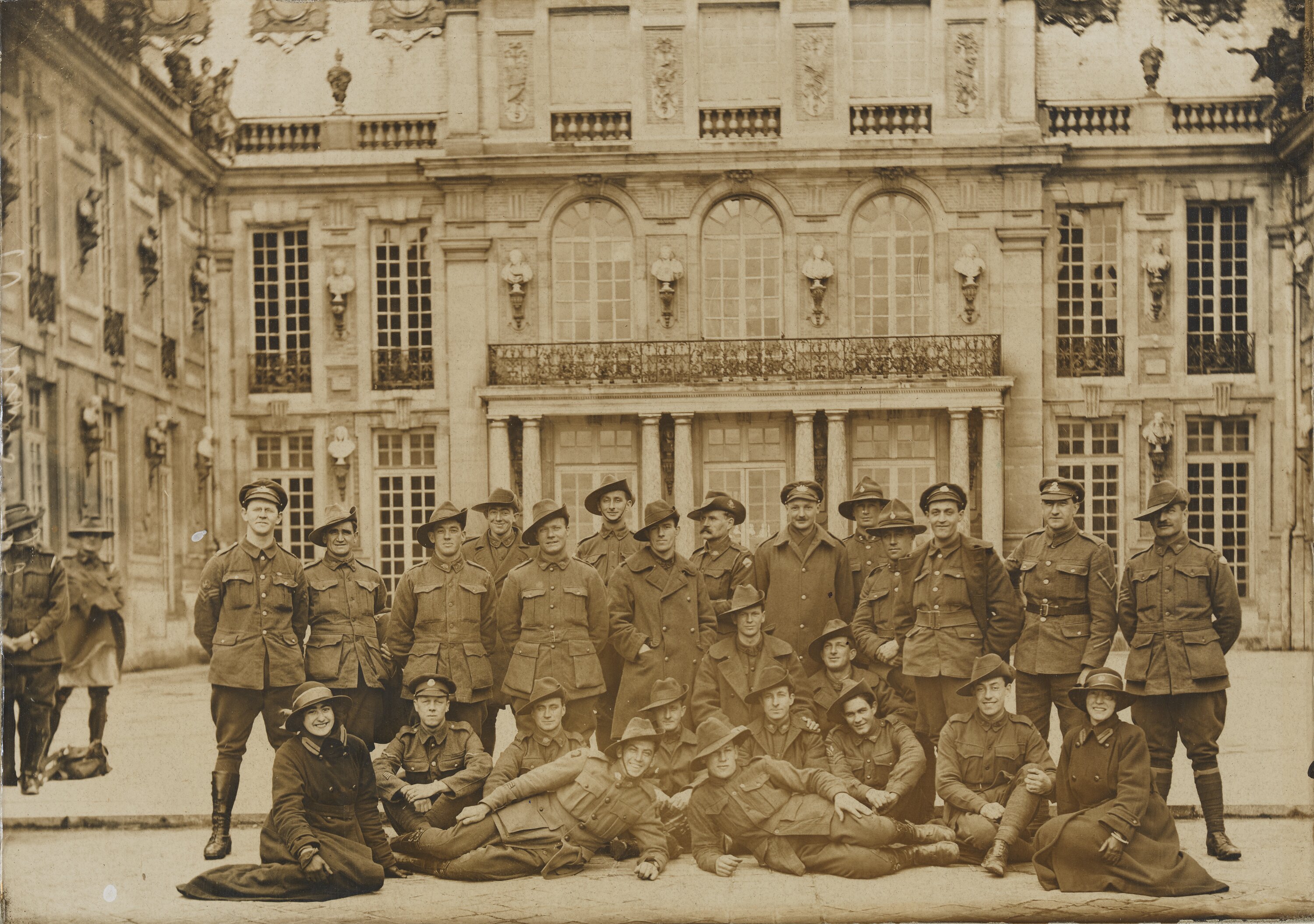 Photograph of a group of men and women in army uniform in front of a building in France, World War I.