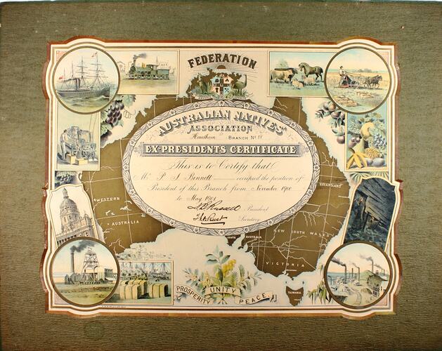 Printed above Coat-of-Arms, centre top edge: FEDERATION Printed in the oval plaque: AUSTRALIAN NATIVES'/ ASSOCIATION/ ... BRANCH No .../ EX-PRESIDENT'S CERTIFICATE/ This is to Certify that/ Mr ... occupied the position of/ President of this Branch from .../ to .../ ...President/ ... Secretary Blanks filled in ink, handwritten: Hawthorn/ 88/ P. J. Bennett/ November 1900/ May 1910/ JB [indis] Russell/ TW Rust