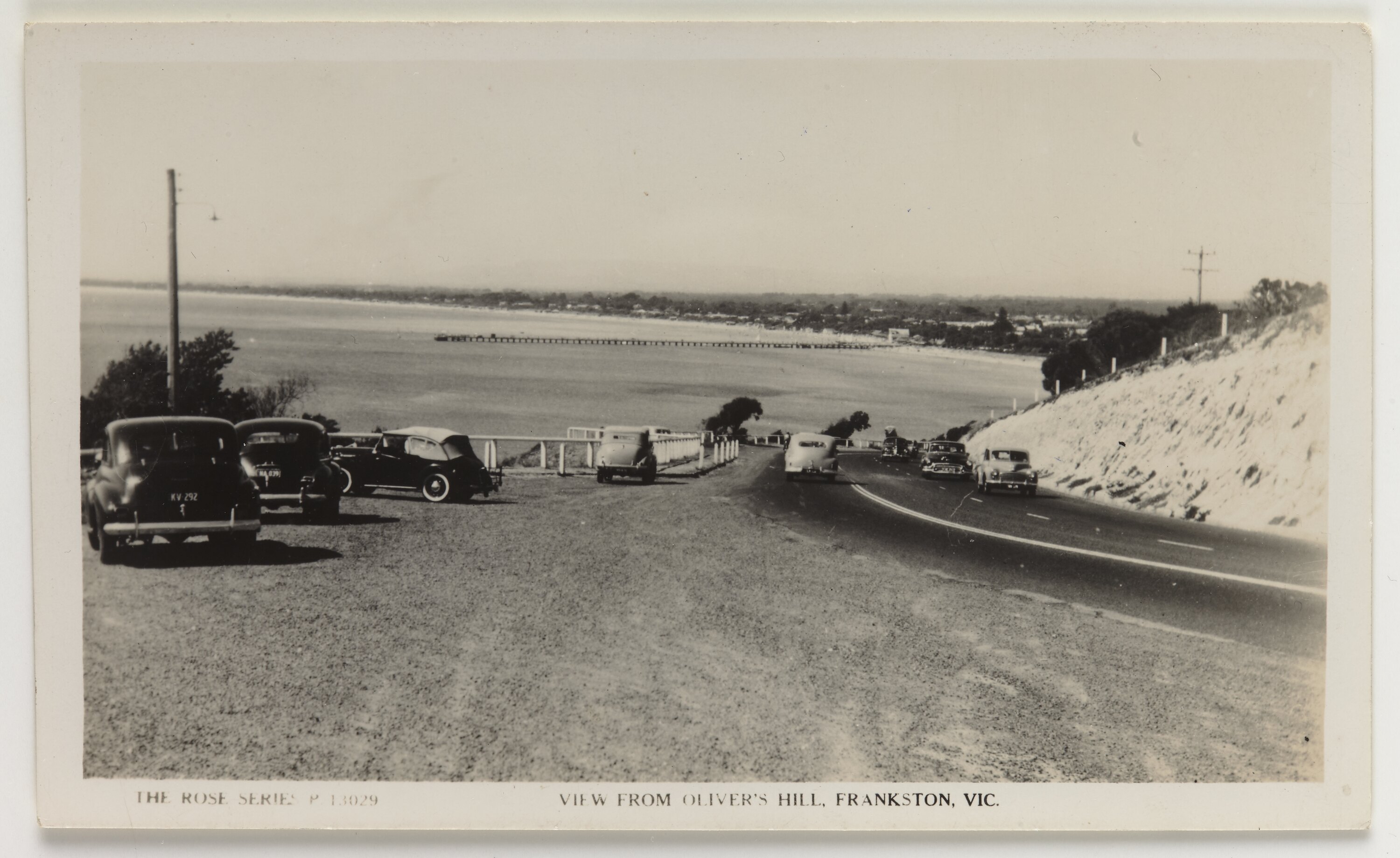 Postcard featuring black and white image of the view from Oliver's Hill in Frankston on the Mornington Peninsula, Melbourne, circa 1955.