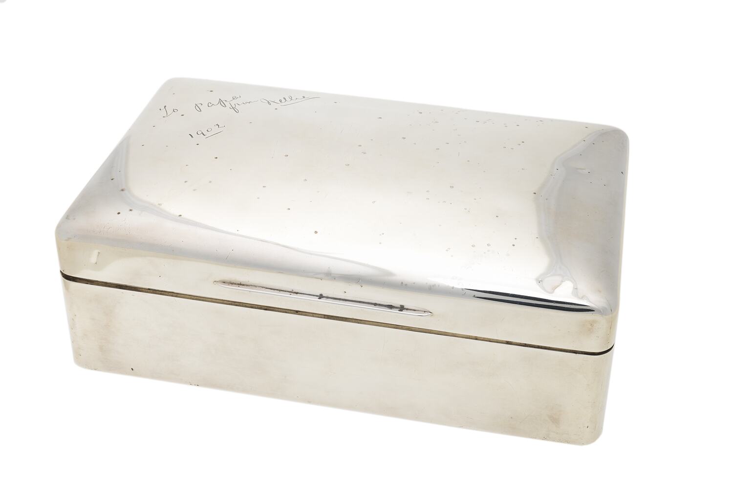 Sterling silver cigar box given by Dame Nellie Melba to her father David Mitchell in 1902. It is inscribed: 'To Papa from Nellie 1902'.
