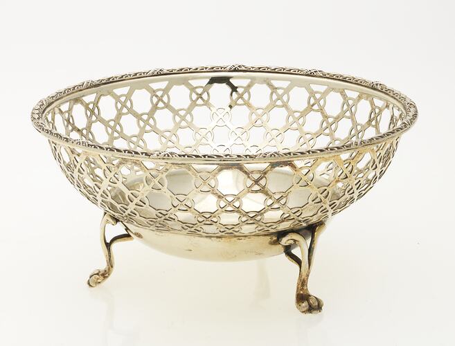 Silver gilt bowl, with cast and applied rim surmounting a finely pierced hemispherical body, supported on bifurcated lion paw feet. Inscribed at top centre base.