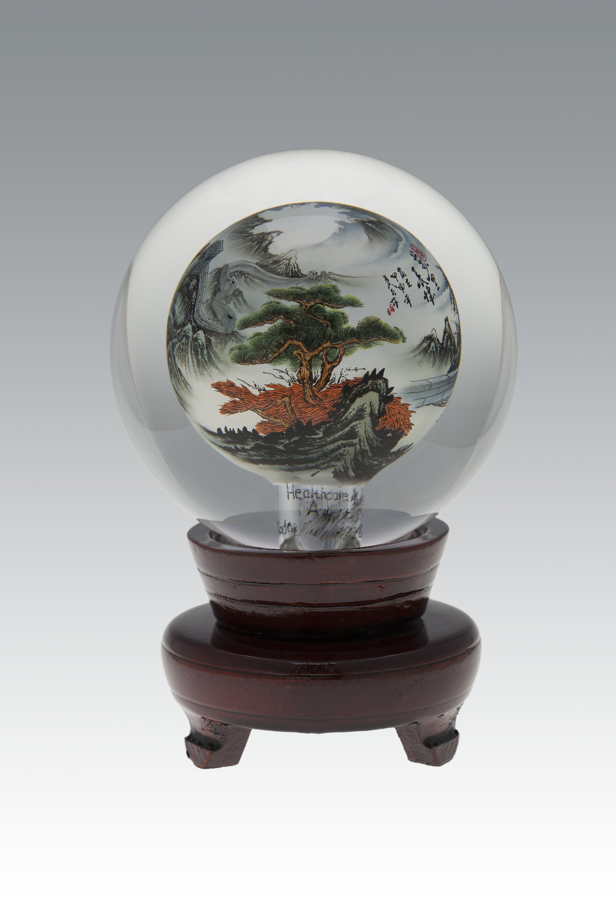 Small desktop presentation glass globe and stand presented to Michael Symonds to celebrate the opening of the Kodak Technology and Innovation Centre, Asia Pacific, in Shanghai, People's Republic of China, 23 August 2004. Michael Symonds, a trained radiologist and now the Director of Hunter New England Imaging, was a member of Kodak's Health Care Advisory Board and was invited to attend the opening.