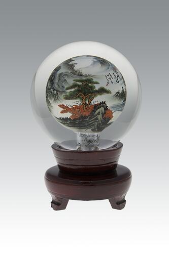 Glass globe with colour image transfer and handwritten text around the base. In a maroon presentation box with lid.