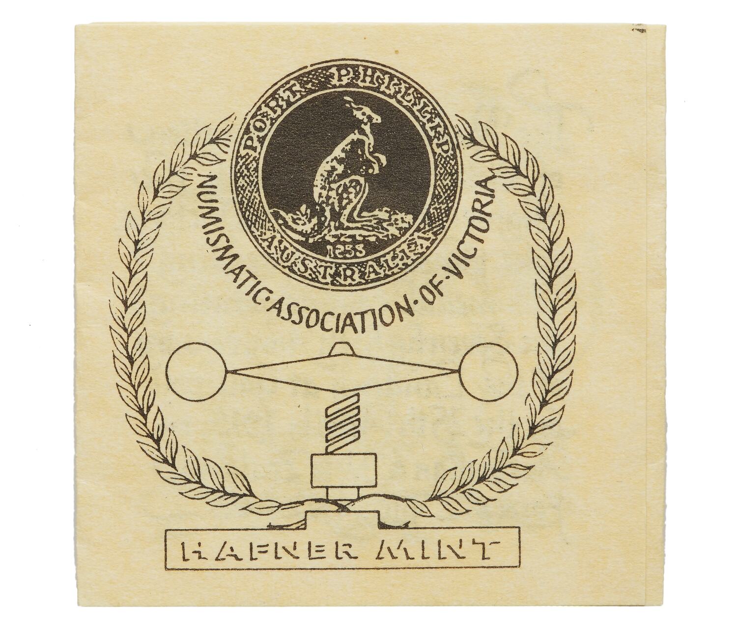 Buff coloured paper with black ink inscription. On the front is the Numismatic Association of Victoria and Hafner Mint logos surrounded by a garland. It is folded into three squares.