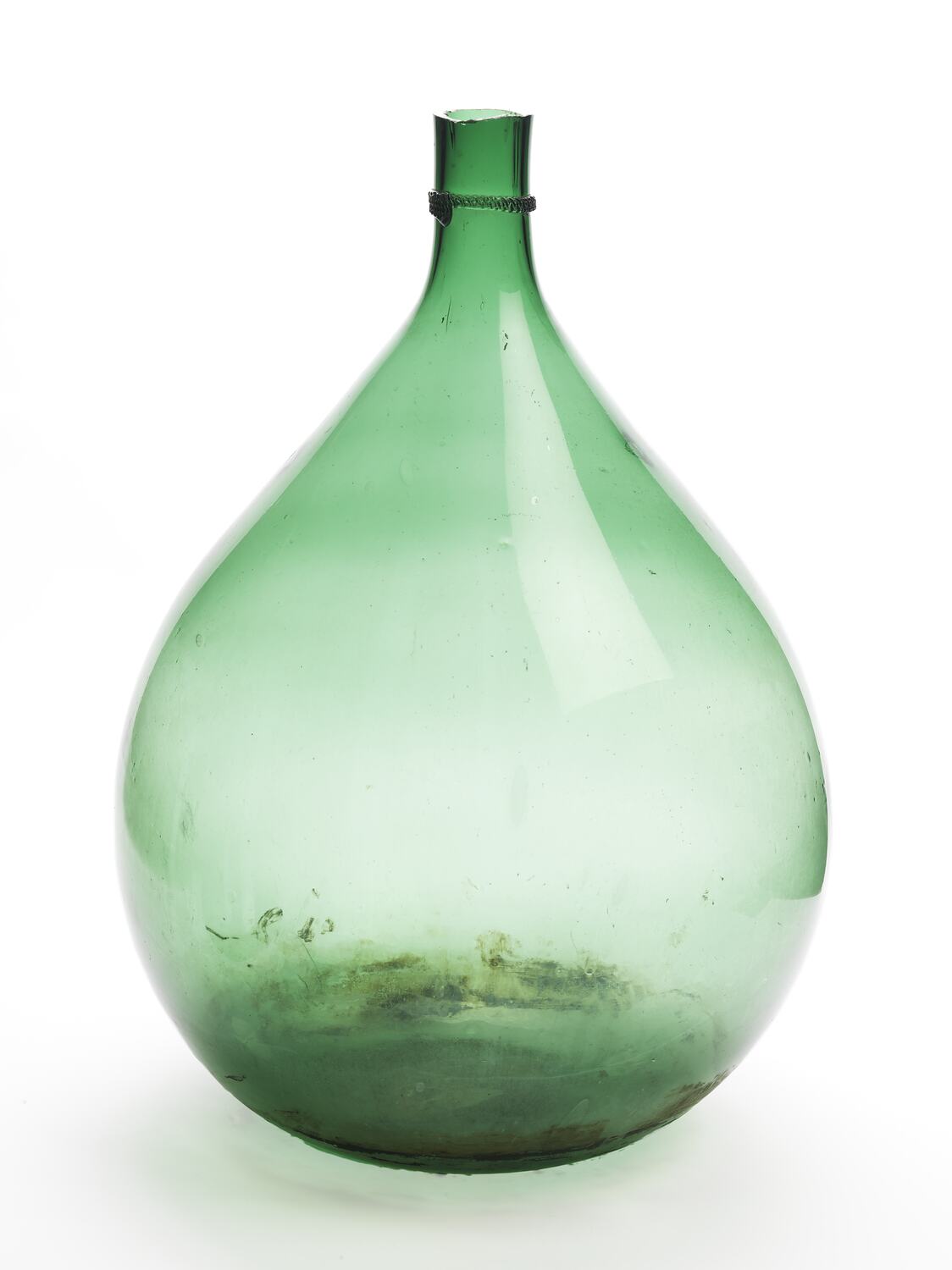 Large glass jar with green tinge, with narrow neck and opening at top. Originally the jar would have had a rubber bung when in use, but this is no longer in existence.